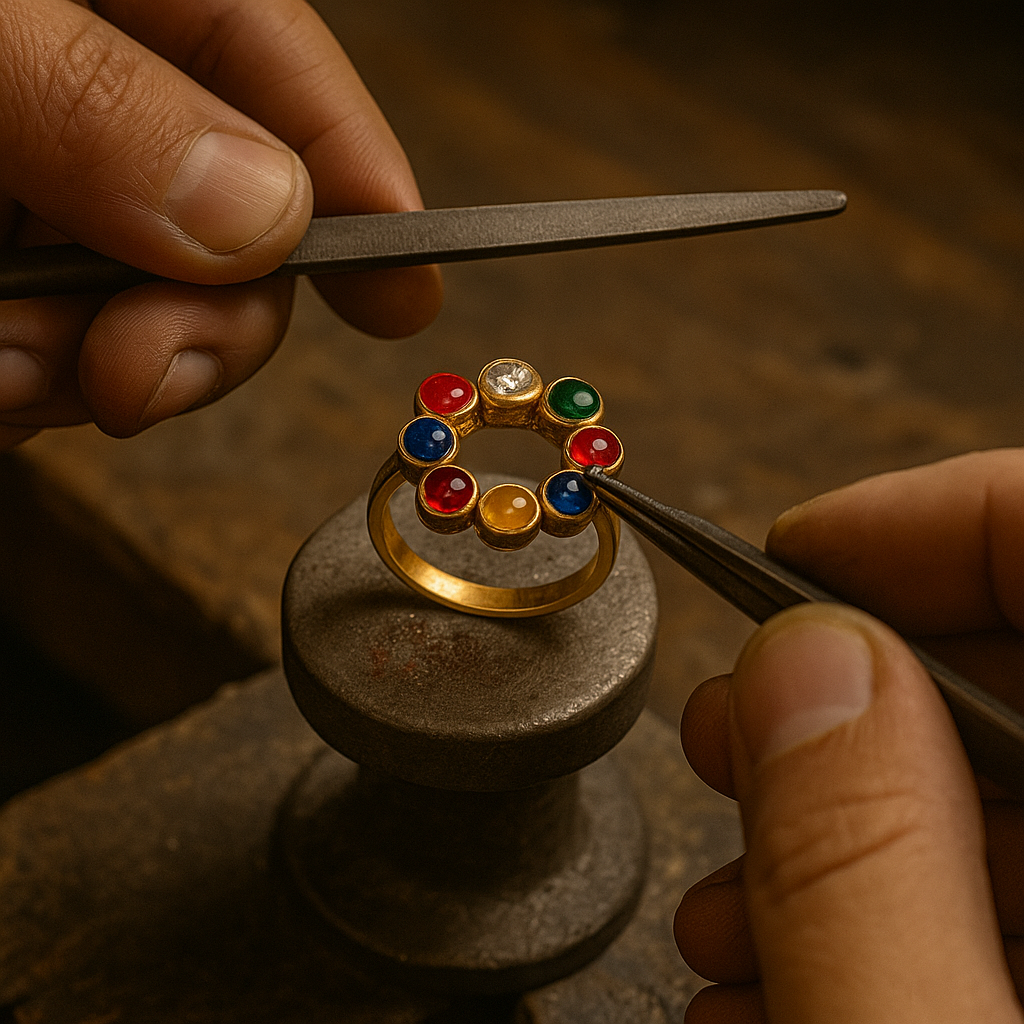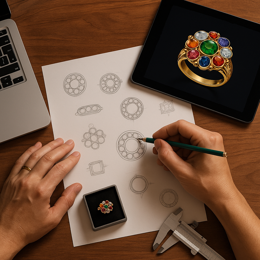 Every creation begins with a vision. Our designers conceptualize each piece through detailed sketches and advanced CAD models, carefully refining every curve and contour to achieve perfection. Metal and gemstone selections, prong placements, and design structures are finalized with precision. This stage ensures that every Navaratna ornament embodies both artistic beauty and spiritual balance.