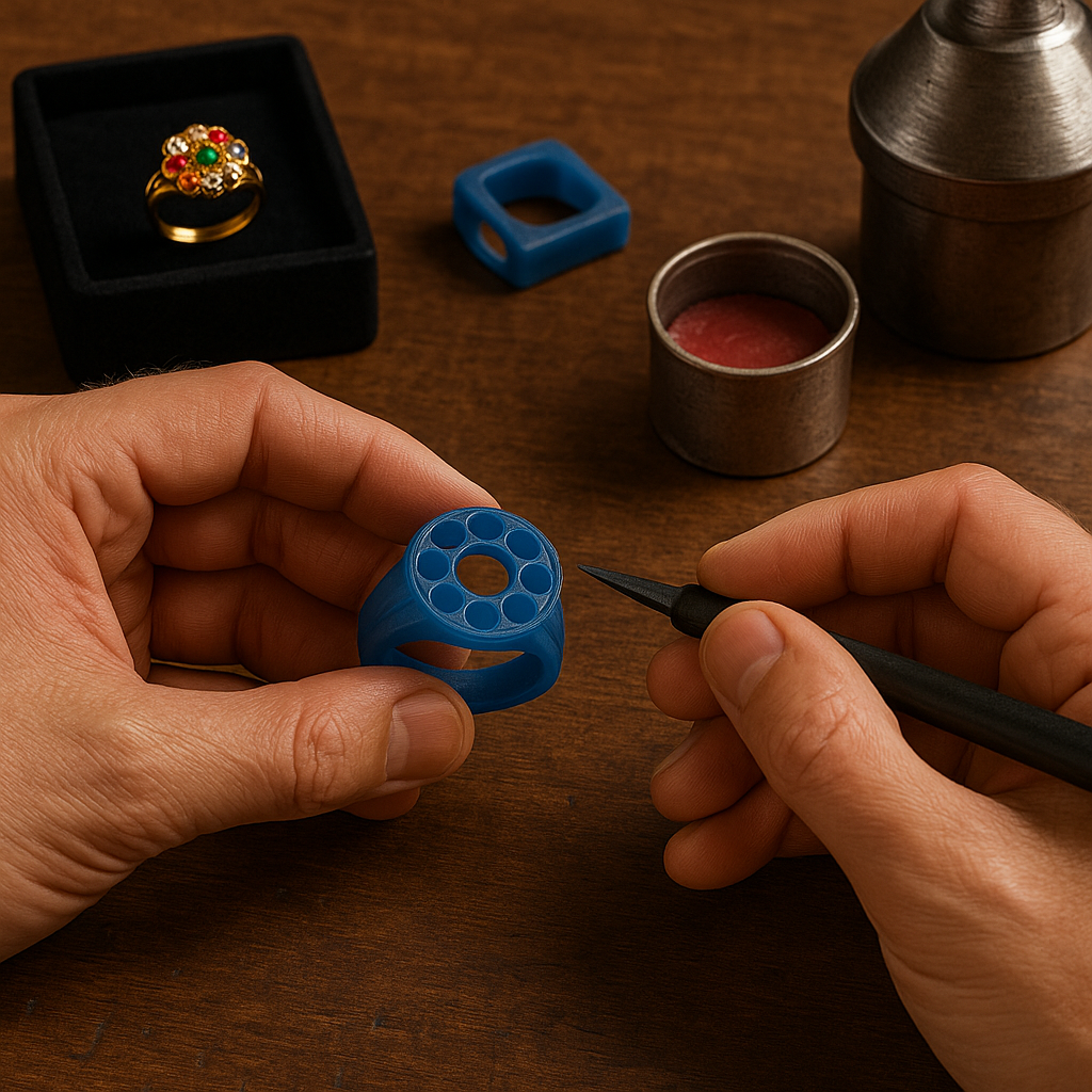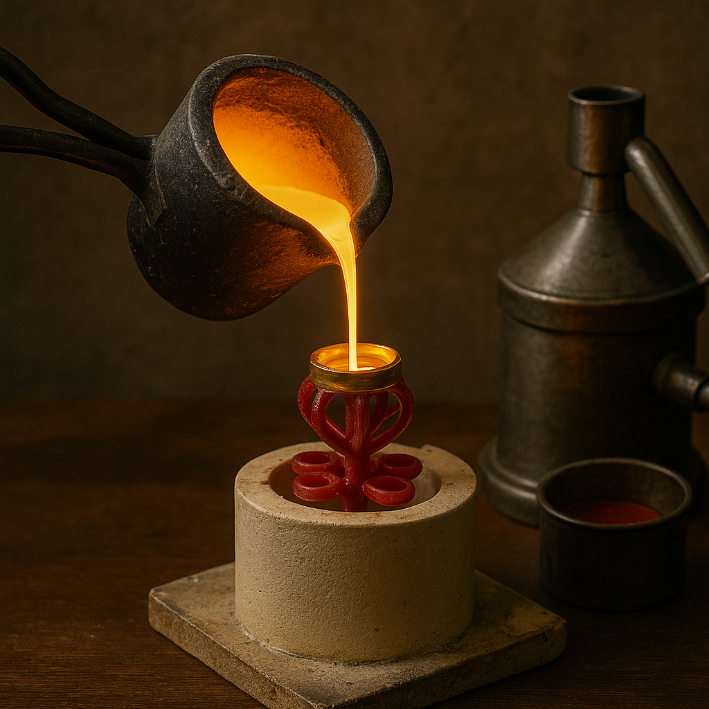 Once the design is approved, a wax model is crafted by hand or created using 3D printing to replicate the final piece in perfect detail. This model is encased in a heat-resistant mold, and through a burnout process, the wax melts away, leaving a hollow impression ready for casting. This delicate stage captures the exact design contours, forming the foundation for flawless metal flow.